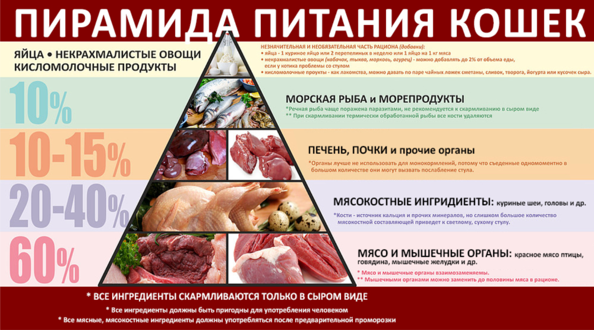 В природе основу рациона дикой кошки составляют мелкие птицы и грызуны, съедаемые целиком вместе со шкуркой, перьями и костями. Одомашненные звери, хотя и живут в более комфортных условиях, тем не менее, остаются облигатными хищниками: мышечное мясо и внутренние органы прекрасно усваиваются и в сочетании с губчатыми костями и овощами восполняют все пищевые потребности животного.